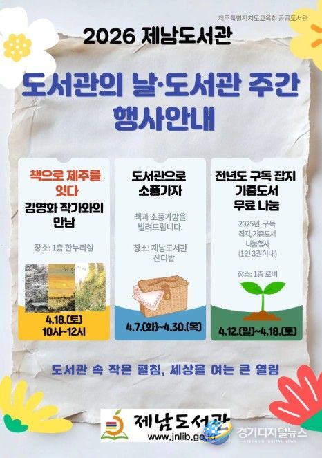 경기디지털뉴스 마성숙 기자 | 제주도교육청 제남도서관은 12일부터 도서관의 날과 도서관주간을 맞아 지역주민과 함께하는 다양한 독서문화 프로그램을 운영한다.
