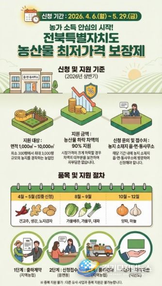 경기디지털뉴스 마성숙 기자 | 전북특별자치도는 가격 변동성이 큰 농산물에 대한 경영안정 지원을 위해 ‘2026년 주요농산물 가격안정 지원사업’ 신청을 4월 6일부터 오는 5월 29일까지 접수한다.