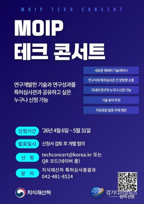 경기디지털뉴스 마성숙 기자 | 지식재산처는 4월 6일~5월 31일까지 기업 및 연구소가 개발하거나 연구한 최신 기술을 특허심사관과 공유하고, 연구자와 특허심사관과의 직접적인 소통을 강화하기 위한 ‘지식재산처(MOIP) 기술 공연(MOIP Tech Concert)'에 참여할 우수 연구자를 모집한다고 밝혔다.