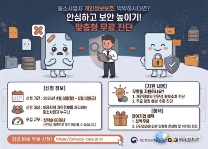 경기디지털뉴스 마성숙 기자 | 개인정보보호위원회는 중소·영세사업자의 개인정보 보호수준을 높이고 유출사고를 사전 예방하기 위해 4월 6일부터 5월 8일까지 ‘중소사업자 안전조치 모니터링’ 시범사업 참여기업을 모집한다.