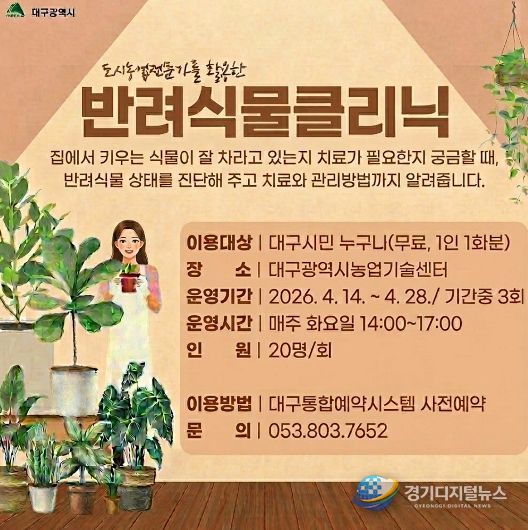 경기디지털뉴스 마성숙 기자 | 대구광역시농업기술센터는 도시농업 전문가를 활용해 오는 4월 14일부터 28일까지 매주 화요일, 총 3회에 걸쳐 ‘반려식물 클리닉’을 운영한다.