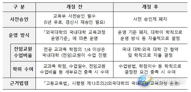 기존에는 국내 대학이 프랜차이즈를 운영하기 위해서 교육부의 사전 승인을 받아야 했으나, 2024년 2월 고등교육법 시행령 개정으로 대학 간 협약만으로도 운영이 가능해졌다. 교육과정의 구성과 수업 운영도 각 대학이 학칙으로 자율적으로 정할 수 있게 되어 현장에서 ‘프랜차이즈’ 운영의 추진력이 높아졌다.