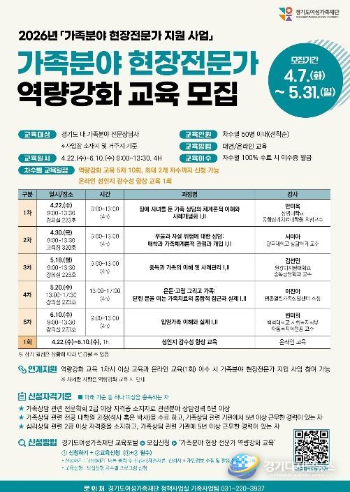 모집대상은 경기도 내 가족분야 전문상담사이며, 교육은 차수별 50명 내외로 총 5차에 걸쳐 운영된다. 신청기간은 4월 7일부터 5월 31일까지이며, 재단 누리집을 통해 차수별로 선착순 모집한다.
