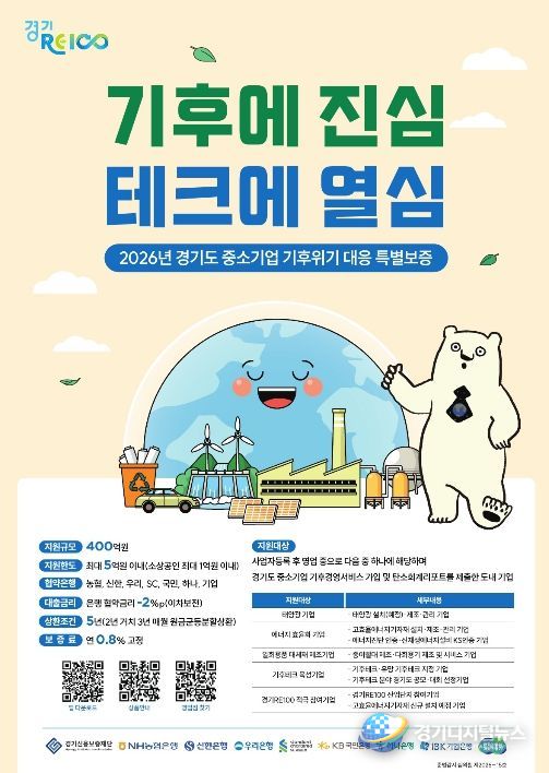경기도는 도내 기업들의 저탄소 전환을 돕고 기후위기 대응 경쟁력을 근본적으로 강화하기 위해 ‘2026년 중소기업 기후위기 대응 특별보증’ 금융 지원을 본격 추진한다고 7일 밝혔다.