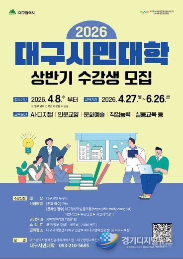 경기디지털뉴스 마성숙 기자 | 대구광역시는 시민의 평생학습 기회를 확대하고 변화하는 학습 수요를 반영해 4월 8일부터 ‘2026년 상반기 대구시민대학’ 수강생을 모집한다.