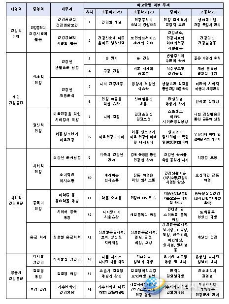 교육부는 현장 의견을 기반으로, 학교에서 활용할 수 있는 교사용 지도서를 개발·배포한다. 이번에 배포하는 지도서는 초등학교부터 고등학교까지 건강증진 교육을 체계적으로 운영할 수 있도록, 시도교육청과 학교의 의견을 수렴해 학교급 전체를 아우르는 주제 영역을 선정했다. 또한, 개발 과정에 학교급별 교원이 직접 참여하여, 상급학교 진학에 따라 학교급에 맞게 건강증진 주제 영역의 교육 내용이 연계·확장되도록 구성했다.