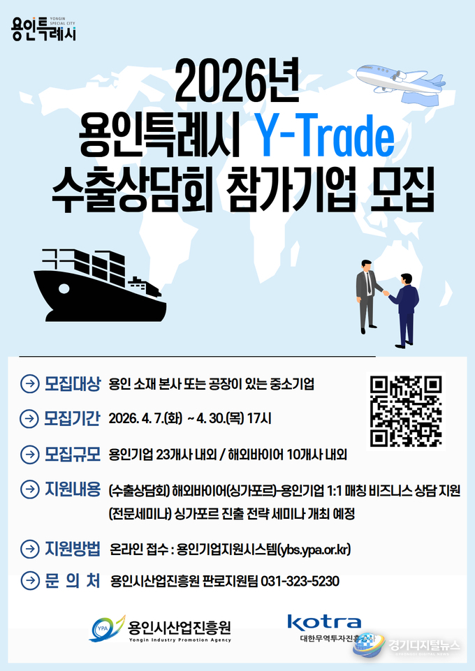 용인시산업진흥원(이사장 이상일, 이하 진흥원)은 지역 중소기업의 해외 판로 개척과 수출 활성화를 지원하기 위해 ‘2026년 용인특례시 Y-Trade 수출상담회’ 참가기업을 4월 7일부터 모집한다고 밝혔다.