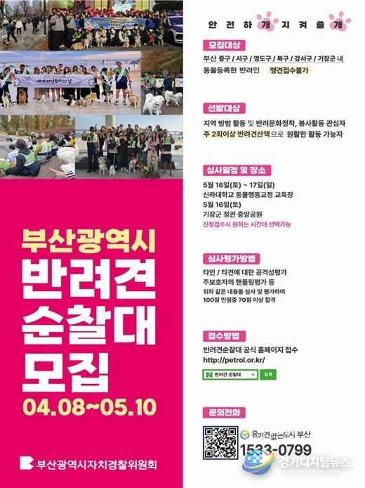 경기디지털뉴스 마성숙 기자 | 부산광역시자치경찰위원회는 올해 '부산 반려견 순찰대'를 부산 전 자치구로 확대 운영한다고 밝혔다.