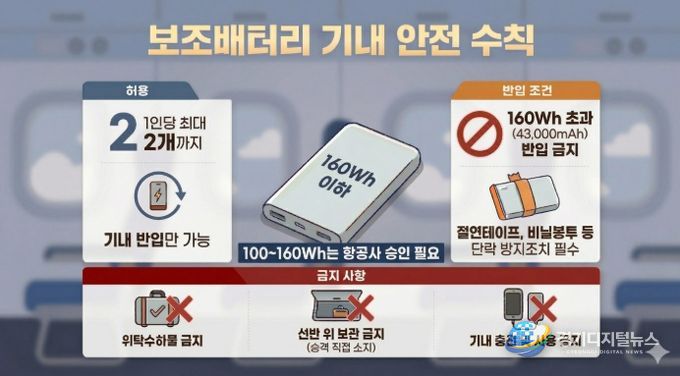 경기디지털뉴스 마성숙 기자 | 정부가 마련한 보조배터리 기내 안전기준이 국제 표준으로 채택되면서, 나라별로 다른 규정 때문에 환승 승객 등이 겪던 혼란 없이, 보다 안전하고 편리하게 항공기를 이용할 수 있게 된다. 4월 20일부터 보조배터리는 1인당 2개까지만 기내 반입이 가능하고, 기내에서는 충전과 사용이 전면 금지된다.