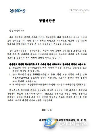 대전 소재 식재료 공급업체를 대상으로 발송한 교육장 청렴 서한문에는 학교급식 관련 공직자에게 금품이나 향응 또는 선물 등을 제공할 수 없음을 명시했다. 또한 관련 공직자가 이를 요구할 경우 대전시교육청 누리집 내 부조리 신고센터로 신고할 수 있도록 안내했다.