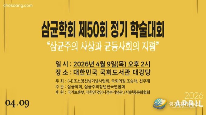 경기디지털뉴스 마성숙 기자 | 2026년 병오년(丙午年)을 맞아 '삼균학회 제50회 정기학술대회'가 국회도서관 대강당에서 개최된다. 이번 학술대회는 (사)조소앙선생기념사업회, 조승래 국회의원실, (사)선우재가 공동 주최하고, 삼균학회와 삼균주의청년연합회가 주관하며, 국가보훈부, 국립대한민국임시정부기념관, (사)한중문화협회가 후원한다.