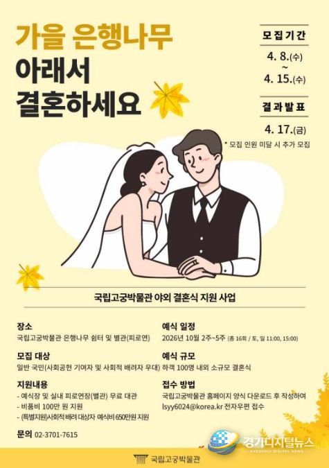 이번 사업은 국립고궁박물관의 가을 명소인 야외 은행나무쉼터를 혼례 장소로 무료 개방해 문화유산 공간에서 특별한 야외 결혼식을 올릴 수 있도록 지원하는 사업이다. 해외 유명 관광지에서 진행되는 야외 혼례처럼 문화유산 공간을 활용한 특별한 결혼식을 제공함으로써 박물관의 관광 명소화에도 기여할 것으로 기대된다.