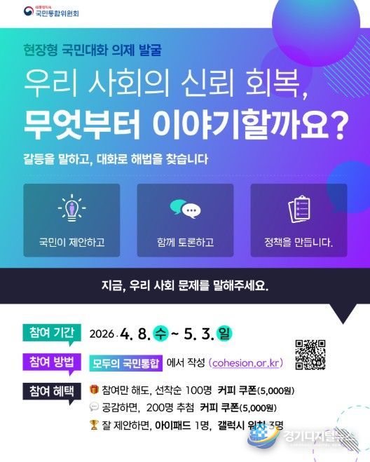 경기디지털뉴스 마성숙 기자 | 대통령직속 국민통합위원회는 올해부터 새롭게 추진하는 '현장형 국민대화'의 온라인 소통 창구인 ‘모두의 국민통합’ 을 4월 8일 10시에 개통하고, 국민통합을 향한 대화에 나선다.