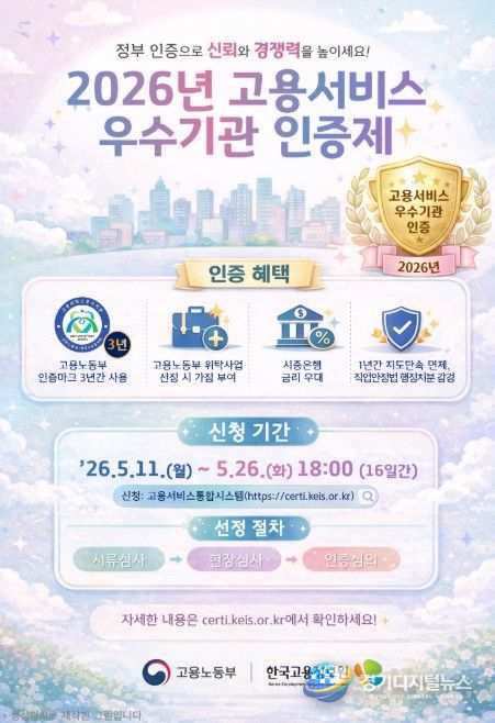 경기디지털뉴스 마성숙 기자 | 고용노동부와 한국고용정보원은 4월 8일 전국 유·무료 직업소개소와 직업정보제공사업체를 대상으로 '2026년 고용서비스 우수기관 인증제' 사업 시행 계획을 공고했다.