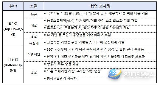 이번 방산 챌린지는 군에 필요한 기술과 창업기업이 보유한 기술을 중심으로 ①군 제안 과제인 탑다운(Top-down) 방식과 ②창업기업 제안 기술인 바텀업(Bottom-up) 방식을 병행하여 추진, 최종 10개 과제를 선정했다.