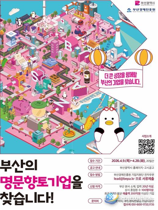 경기디지털뉴스 마성숙 기자 | 부산시와 부산경제진흥원은 오랜 기간 기업 활동을 통해 고용 창출, 인재 양성, 사회 공헌 등 지역경제 발전에 기여한 대표 기업을 발굴·격려하기 위해 '2026년 부산시 명문향토기업'을 공개 모집한다고 밝혔다.