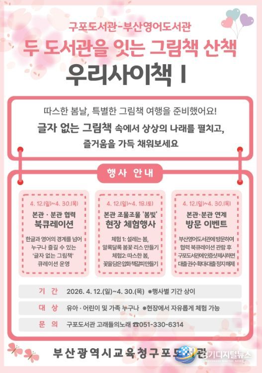경기디지털뉴스 마성숙 기자 | 부산광역시립구포도서관은 오는 12일부터 30일까지 도서관의 날 및 도서관주간을 맞아 구포도서관과 부산영어도서관에서 유아·어린이, 도서관 이용자를 대상으로 독서문화 협력 사업 ‘우리사이책Ⅰ’을 운영한다.