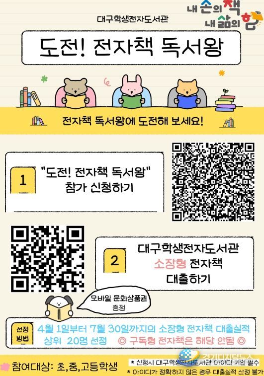 이번 행사는 대구학생전자도서관 초·중·고등학생 이용자와 관내 초·중·고등학교를 대상으로 하며, 주요 내용은 ‘도전! 전자책 독서왕’, ‘전자책 좀 읽는 우리 학교’ 2개 프로그램으로 구성된다.