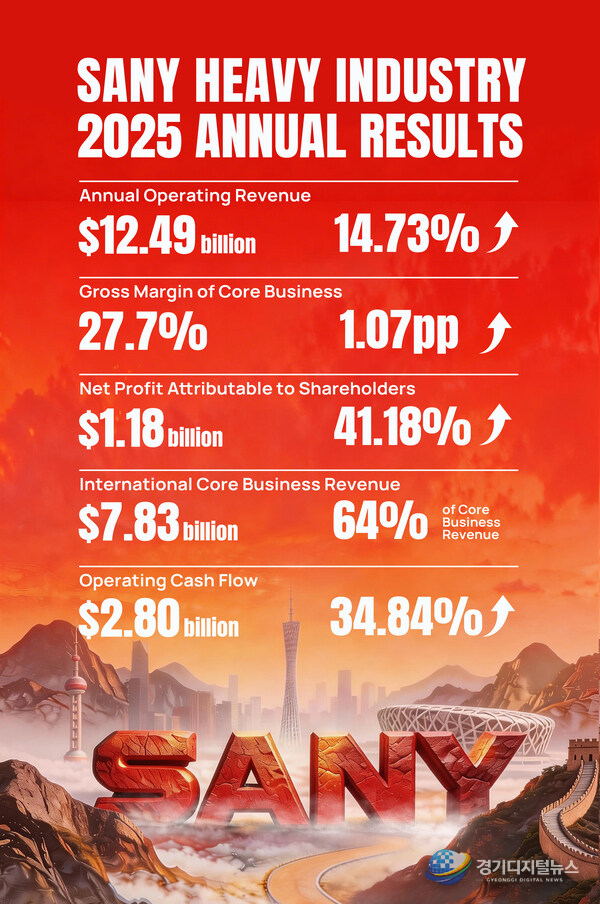 베이징, 2026년 4월 9일 -- 산이 중공업(SANY Heavy Industry)(600031.SH, 06031.HK)이 2025년 재무 실적을 발표했다. 매출은 전년 대비 14.73% 증가한 124억 9000만 달러를 기록했다. 주주 귀속 순이익은 41.18% 상승한 11억 8000만 달러를 달성했다. 영업 활동으로 인한 순 현금 창출액은 전년 대비 34.84% 증가한 28억 달러를 기록했다.