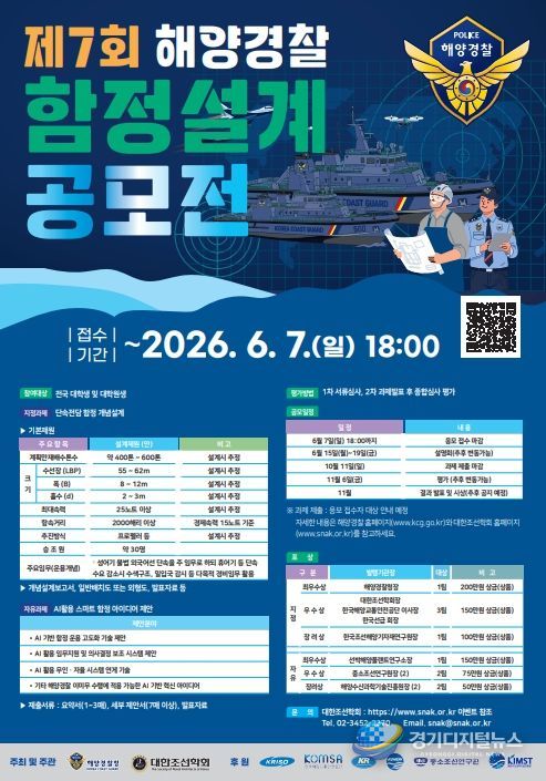 경기디지털뉴스 마성숙 기자 | 해양경찰청은 국민 참여형 공모전인 '제7회 해양경찰 함정설계 공모전'을 개최한다고 밝혔다.