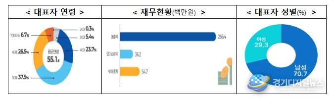 대표자 연령은 평균 55.1세, 성별은 남성 70.7%, 여성 29.3%로 조사됐으며, 기업당 평균 매출액은 266.4백만원, 당기순이익은 36.2백만원으로 나타났다.