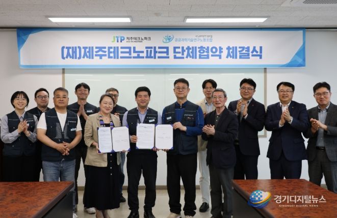 경기디지털뉴스 마성숙 기자 | 제주테크노파크(원장 지영흔,제주TP)와 공공과학기술연구노동조합 제주TP지부(위원장 최연택, 지부장 권철만)이 화합과 신뢰를 바탕으로 한 ‘단체협약’을 체결하며, 상생적 노사관계 정착과 지역 혁신성장의 동반자로서 공동 발전을 다짐했다.