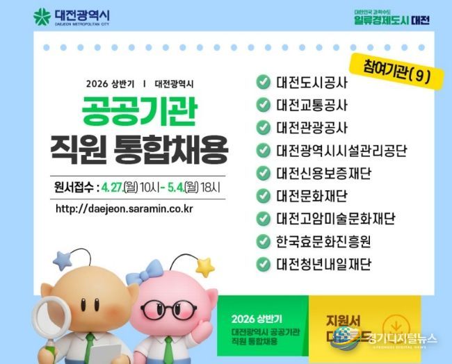 경기디지털뉴스 마성숙 기자 | 대전시가 유능한 인재 확보를 위해 2026년 상반기 산하 공공기관 직원 통합채용을 실시한다.