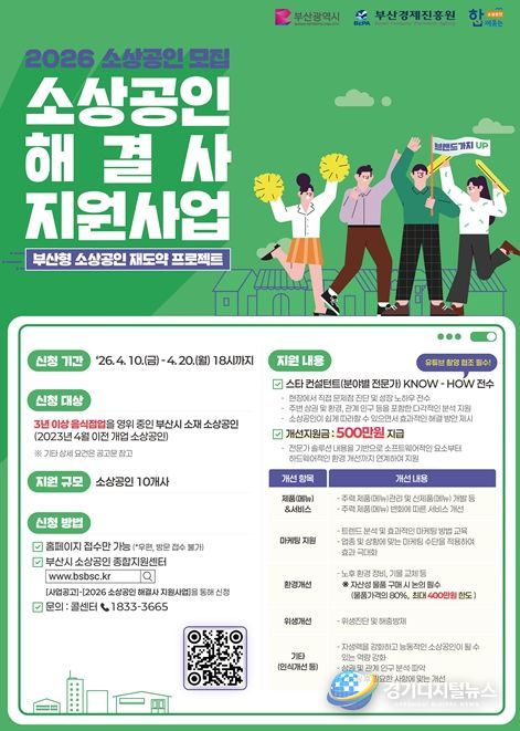 경기디지털뉴스 마성숙 기자 | 부산시(시장 박형준)와 (재)부산경제진흥원은 오늘(10일)부터 오는 4월 20일까지 '소상공인 해결사 지원사업'에 참여할 지역 음식점업 소상공인을 모집한다고 밝혔다.