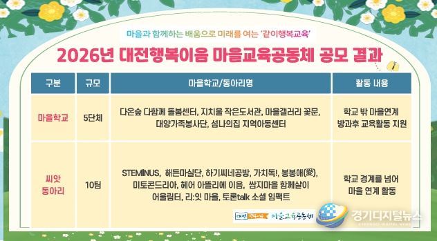 경기디지털뉴스 마성숙 기자 | 대전시교육청은 지역사회와 함께 성장하는 마을교육공동체 활성화를 위해 2026년 대전행복이음 마을학교와 씨앗동아리를 최종 선정했다고 밝혔다.