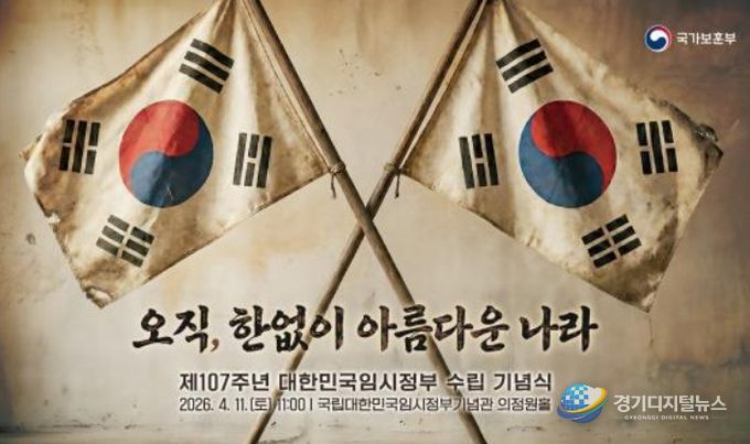 경기디지털뉴스 마성숙 기자 | 국가보훈부는 1919년 4월 11일 조국독립을 위해 수립된 임시정부의 자랑스러운 역사를 기억하고, 그 법통과 정신을 계승하기 위한 ‘제107주년 대한민국임시정부수립 기념식’을 11일 오전, 서울 서대문구 국립대한민국임시정부기념관(의정원홀)에서 거행한다고 밝혔다.
