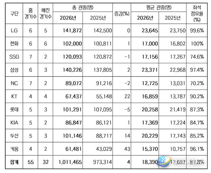 경기디지털뉴스 마성숙 기자 | 2026 신한 SOL KBO 리그가 오늘(10일) 열린 잠실, 고척, 수원, 대전, 대구 경기에 총 9만 1,459명이 입장하며 100만 관중을 달성했다.