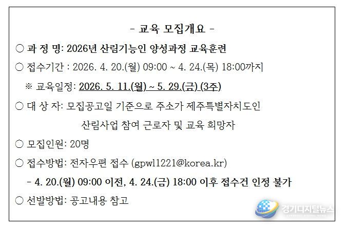이번 교육은 5월 11일부터 29일까지 3주간 산림조합중앙회 제주지역본부에서 진행되며, 공고일 기준 제주도에 주소지를 둔 도민이면 누구나 신청할 수 있다.