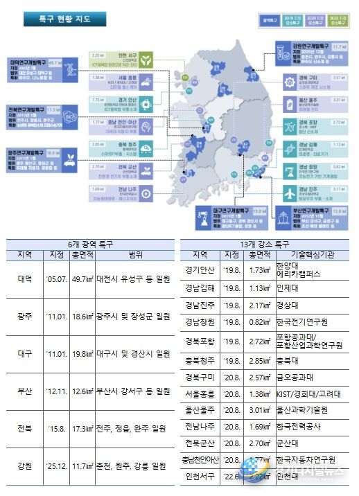 연구개발특구(이하 ‘특구’)는 지역의 산학연 연구개발을 촉진하고, 상호 협력을 활성화하며, 연구개발 성과의 상업화·창업을 지원하는 핵심 거점으로, 현재 대덕을 비롯한 광주, 대구, 부산, 전북, 강원 등 6개의 광역특구와 기술 핵심 기관 중심의 소규모·고밀도 혁신 산학 협력지구(클러스터)인 13개의 강소 특구가 지정되어 있다.