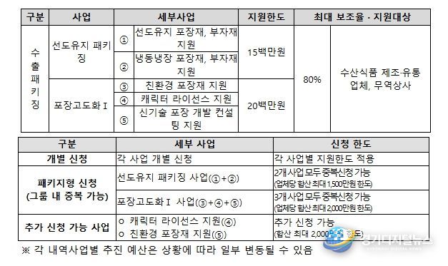 수산식품 수출업체당 최대 2,000만 원까지 ▲ 선도유지 포장재․부자재 ▲ 냉동·냉장 포장재․부자재 ▲ 친환경 포장재․부자재 ▲ 캐릭터 사용권 ▲포장재 개발 컨설팅 등 수출에 필요한 다양한 분야를 지원한다.