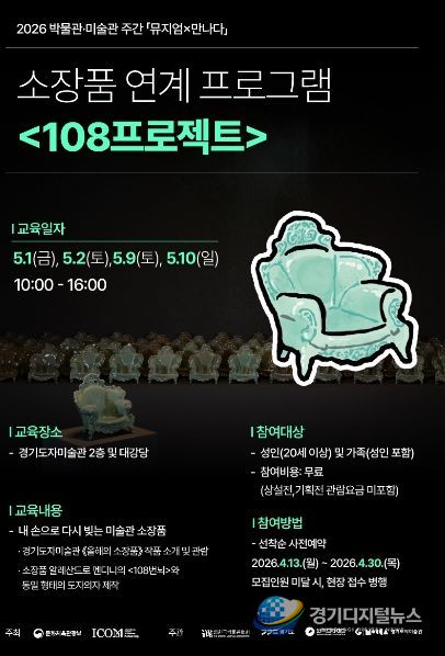한편 ‘108프로젝트’는 2026 박물관·미술관 주간 ‘뮤지엄×만나다’ 사업의 일환으로 추진된다. ‘뮤지엄×만나다’는 문화체육관광부와 국제박물관협의회 한국위원회가 주최하고 한국박물관협회가 주관하는 전국 문화 확산 사업으로 경기도자미술관은 2025년에 이어 2년 연속 참여하고 있다.