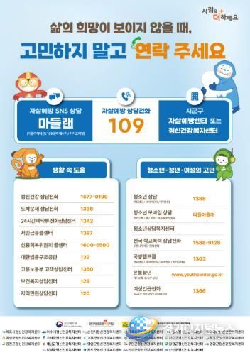 또한 3월부터 5월까지 자살 고위험 시기를 맞아 전 시군과 함께 생명존중 캠페인, 홍보활동을 집중 추진하고, 필요시 누구나 상담받도록 자살예방 상담전화 109와 정신건강 상담전화 1577-0199 안내를 강화한다.