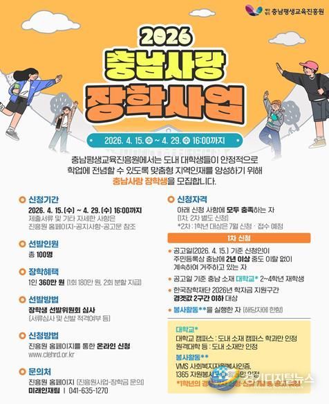 경기디지털뉴스 마성숙 기자 | 충남평생교육진흥원은 충남 인재의 외부 유출을 방지하고 맞춤형 지역인재를 양성하기 위해 4월부터“충남사랑 장학사업”을 추진한다고 밝혔다.
