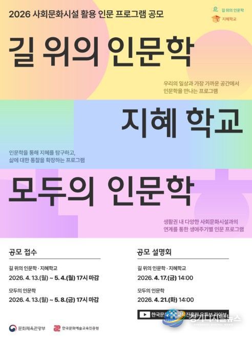 경기디지털뉴스 마성숙 기자 | 문화체육관광부는 인문 전담기관으로 지정된 한국문화예술교육진흥원과 함께 ‘2026년 사회문화시설 활용 인문 프로그램 운영 사업’을 추진한다. 이를 위해 ‘길 위의 인문학’과 ‘지혜학교’ 운영기관은 4월 13일부터 5월 4일까지, ‘모두의 인문학’ 운영기관은 4월 13일부터 5월 8일까지 이(e)나라도움(국고보조금통합관리시스템)을 통해 공모한다.