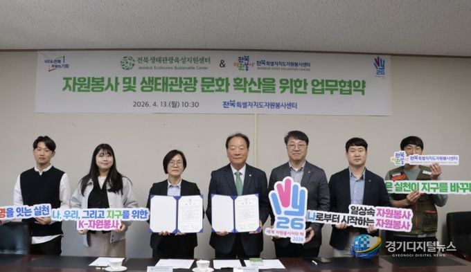 경기디지털뉴스 마성숙 기자 | (사)전북특별자치도자원봉사센터와 전북생태관광육성지원센터는 4월 13일 전북자원봉사센터 이사장실에서『자원봉사 및 생태관광 문화 확산을 위한 업무협약』을 체결하고, 지속가능한 지역발전과 환경보호 실천을 위한 협력의 첫걸음을 내딛었다.