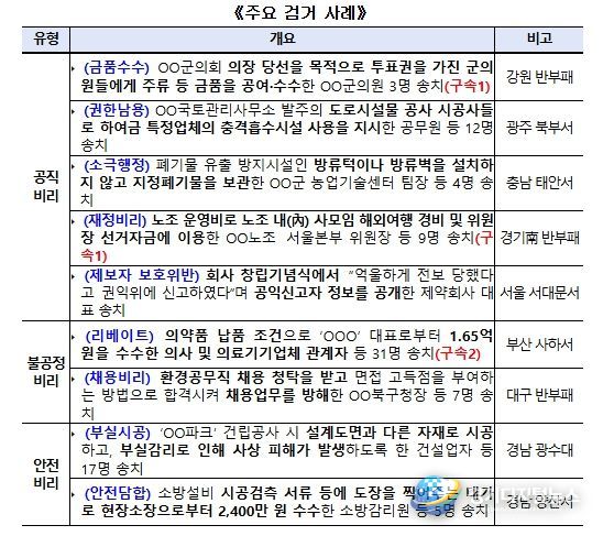 분야별 현황은 ① 공직비리 사범 998명(구속 36명) ② 불공정비리 사범 462명(구속 18명) ③안전비리 사범 537명(구속 2명)으로 나타났다.