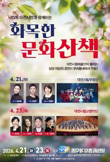 경기디지털뉴스 마성숙 기자 | 대전시립예술단은 4월 21일과 23일 오후 7시 30분, 동구청 12층 강당에서 봄의 시작과 함께‘2026 화목한 문화산책’의 첫 공연을 선보인다.
