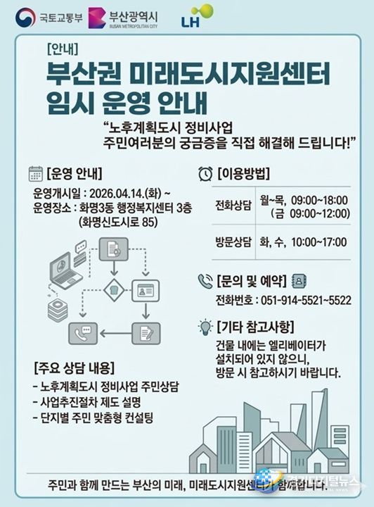 경기디지털뉴스 마성숙 기자 | 부산시는 노후계획도시 정비사업의 본격화에 대응해, 주민 상담과 맞춤형 컨설팅을 전담하는 비수도권 최초의 '부산권 미래도시지원센터'를 오늘(14일)부터 임시 운영한다고 밝혔다.