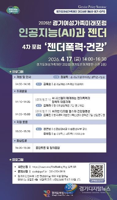 경기디지털뉴스 마성숙 기자 | 경기도여성가족재단은 오는 17일 재단 회의실에서 ‘인공지능과 젠더폭력·건강’을 주제로 4차 경기여성가족미래포럼을 개최한다. 3월부터 5월까지 총 5차례 진행하는 경기여성가족미래포럼 중 이번이 4회차다.