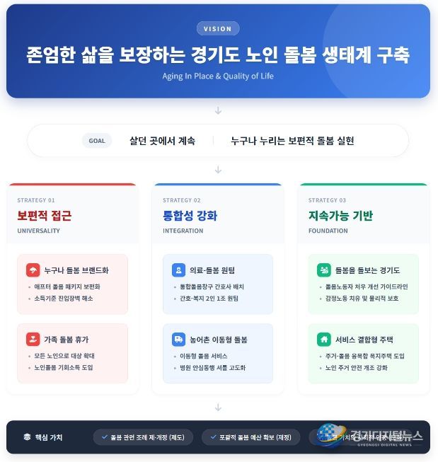 경기디지털뉴스 마성숙 기자 | 경기연구원이 빠르게 늘어나는 노인 인구에 대응해 ‘돌봄 생태계’ 구축을 핵심 해법으로 제시했다. 단순히 시설을 늘리는 방식이 아니라, 노인이 살던 집과 지역에서 계속 살아갈 수 있도록 다양한 돌봄 주체가 연결되는 새로운 시스템이다.