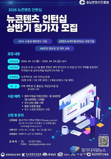 경기디지털뉴스 마성숙 기자 | 충남콘텐츠진흥원은 도내 콘텐츠 산업 인재 양성과 일자리 창출을 위해 ‘2026 뉴콘텐츠 인턴십’ 상반기 참가자를 모집한다고 밝혔다.