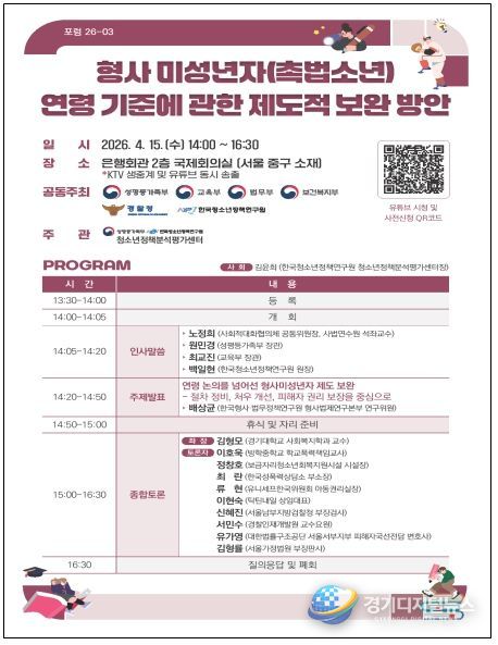 경기디지털뉴스 마성숙 기자 | 교육부, 성평등가족부, 법무부, 보건복지부, 경찰청, 한국청소년정책연구원은 4월 15일 14시 은행회관에서 「형사미성년자(촉법소년) 연령 기준에 관한 제도적 보완 방안」을 주제로 제2차 포럼을 공동 개최한다.