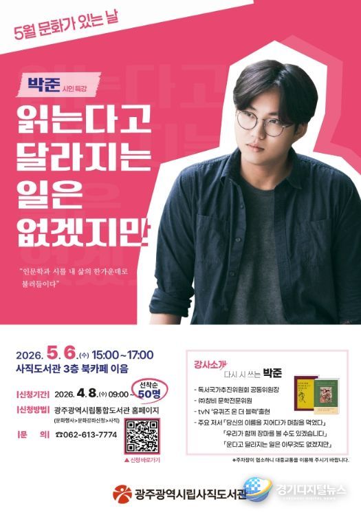 조인숙 사직도서관리장은 “박준 시인의 조용하지만 깊은 언어가 시민 일상에 작은 위로와 여백이 되길 바란다”며 “이번 강연이 문학을 통해 서로의 마음을 이어주는 따뜻한 시간이 되길 기대한다”고 말했다.
