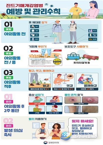 또한 야외활동 후에는 즉시 샤워를 하고 옷을 세탁하며, 귀 주변이나 팔 아래, 무릎 뒤 등 진드기가 붙기 쉬운 부위를 꼼꼼히 확인하는 것이 중요하다.