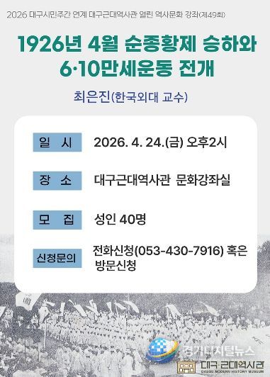 경기디지털뉴스 마성숙 기자 | 대구문화예술진흥원 박물관운영본부 소속 대구근대역사관은 2026년 대구시민주간 연계행사로 4월 24일 오후 2시에 ‘1926년 4월 순종황제 승하와 6·10만세운동 전개’를 주제로 전문가 특강을 개최한다.