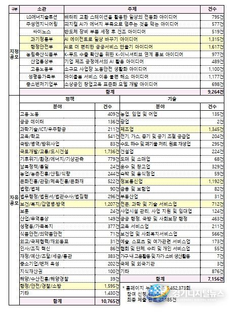 분야별로 살펴보면, 자유공모 정책분야에 가장 많은 10,765건(39.6%)이 접수됐으며, 지정공모 9,264건(34.1%), 자유공모 기술분야 7,156건(26.3%) 순으로 집계됐다.